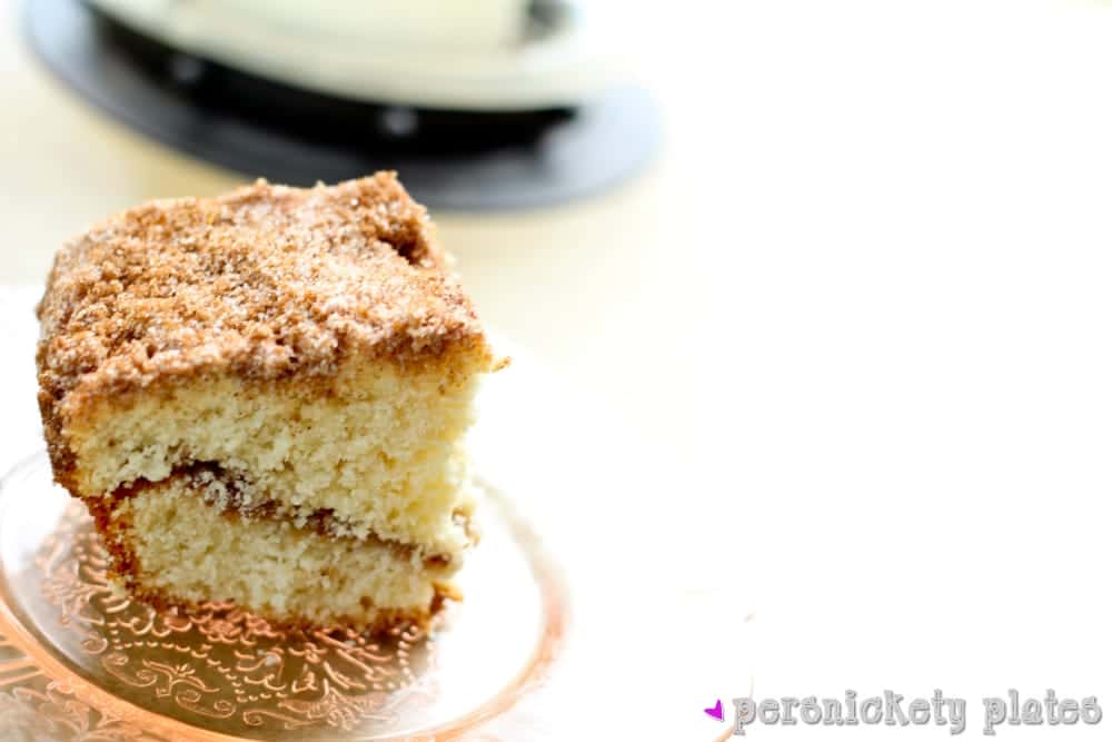 Enjoy a slice of coffee cake any time of the day. We love to sneak a piece for breakfast or a snack with a nice cup of coffee or medicine ball tea (a Starbucks copycat). The kids will usually have a glass of milk or a mug of slow cooker hot chocolate.