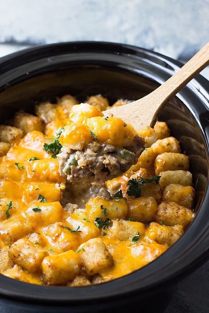 Crock Pot Bacon Cheeseburger Tater Tot Casserole ~ Easy Slow Cooker Twist on a Classic Tater Tot Casserole! It’s creamy, cheesy and comfort food made easy!