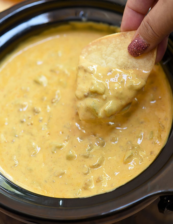Recreate your favorite cheesy dip with this copycat Chili's queso recipe! Made with just a few simple ingredients added to the slow cooker to cook low and slow until that cheesy, beefy dip is infused with plenty of seasoning and spice!