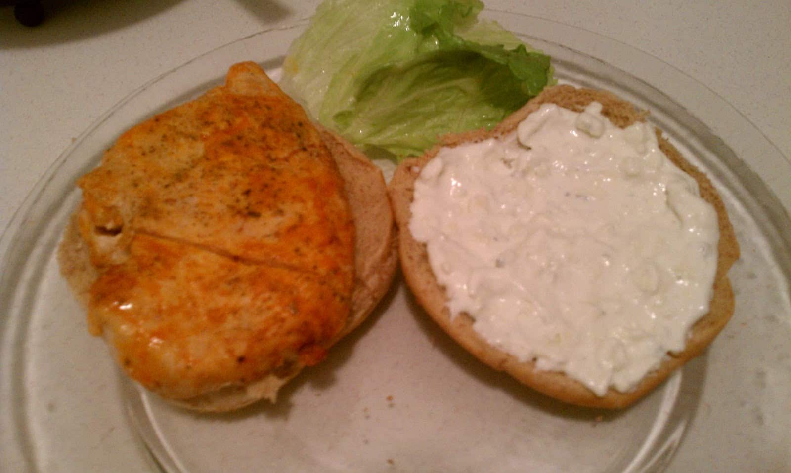 2. Step Four: Toast your buns, then add a chicken breast to the bottom, slather the top bun with bleu cheese sauce, and add some crisp lettuce. Enjoy!