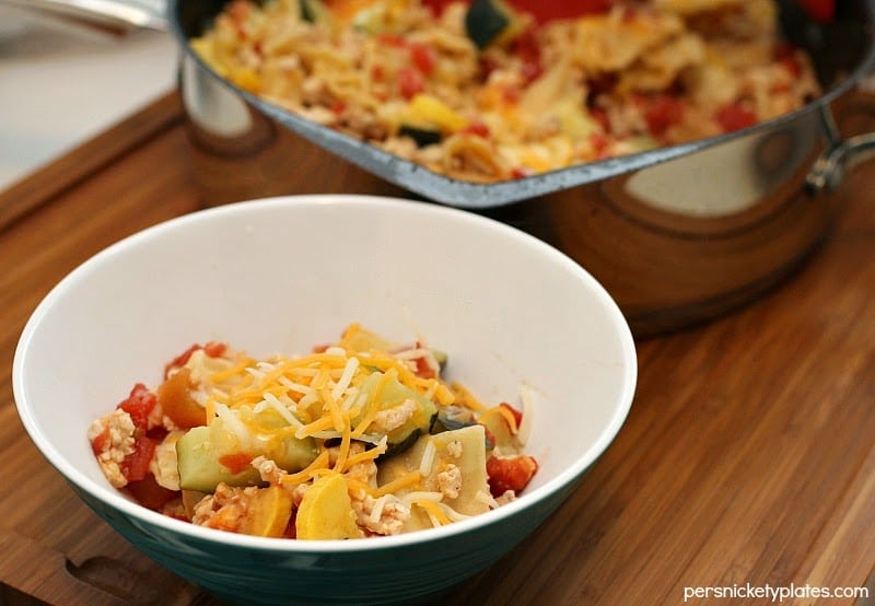 Last year I made a Turkey Veggie Skillet Lasagna that was really good and I was going to make it again but due to pantry restrictions, I put a Mexican twist on it and loved the way it turned out. It comes together really quickly (one of my favorite qualities in a recipe), it tastes really good (an obvious requirement), and it’s fairly healthy (bonus!).