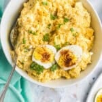 Learn how to make the perfect devilled egg potato salad recipe by combining sweet and spicy deviled eggs with a creamy potato salad, two classic recipes we all expect to see at a potluck or backyard cookout. It's an easy, inexpensive way to serve a crowd, and it's so good that everyone will be hoping there's enough left to take some home!